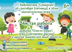 26 сентября в 16-00 в муниципальной библиотеке "Северная" (Иркутский тр. 80/1) для детей младшего школьного возраста пройдет экологическая игра "Чистая работа". Участники разделятся на команды и научатся правильно сортировать мусор, с помощью магнитных удочек очистят игровое "озеро" и выполнят другие интересные задания. В ходе игры ребята проверят свои знания о раздельном сборе отходов и вспомнят о необходимости ответственного отношения к природе. Приглашаем всех желающих, вход свободный.